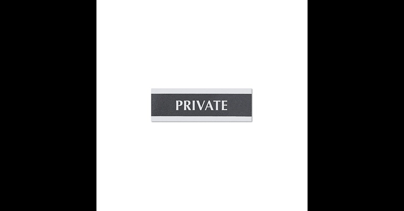 Office sign that measures 9" x 1/2" x 3". Headline Century Office Signs. Private. 9"x1/2"x3". 1 Each. Silver with black background. Includes easel for countertop display and double-sided tape for door and wall display.