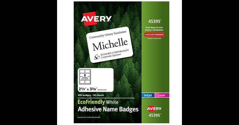 Stay eco-conscious when meeting new faces for the first time with Avery EcoFriendly Name Badges. These name tag labels are designed to work for you and the environment. Both the label paper and package are produced with 100% recycled material and are processed chlorine-free to reduce the harmful substances associated with the manufacturing process. After use, you can continue to help the environment because both the label paper and package are recyclable. The name labels and package are also printed with soy- and vegetable-based inks, which come from renewable materials, rather than solvent-based inks. Adhesive name tags stick and stay on most clothing materials* with removable adhesive that water-based and 100% recyclable. These durable adhesive name labels are fantastic for corporate events, reunions, parties and showers. The printable rectangle labels also make great organization labels, gift tags, arts and craft stickers and more. They're perfect for teachers to use as student name tags for classrooms, assigning cubbies or desks, labeling supplies and more. Add that personal touch to your personalized name badges by hand or customize them easily using the free templates and designs found on the Avery website, and print them easily on your laser or inkjet printer. Item comes with a total of 400 blank name tags. *Not recommended for use on corduroy, plastic, leather, silk, suede, velvet, vinyl or other delicate fabrics. Ideal for any environmentally friendly enthusiast, the eco-friendly name badge labels and packaging are processed chlorine-free and designed with 100% recycled material that can all be recycled. Great for use in the classroom, for volunteer work, on craft projects and labeling storage, these self-adhesive rectangle labels let you personalize any event or situation. Name tag stickers stick and stay in place, yet remove cleanly and easily with removable adhesive that is water-based. Quickly create custom name badge labels by hand or print your custom stickers on the 8. 5" x 11" sheets with your laser or inkjet printer. Easily customize your name tag labels using the free designs and templates on the Avery website; item comes with a total of 400 printable labels.