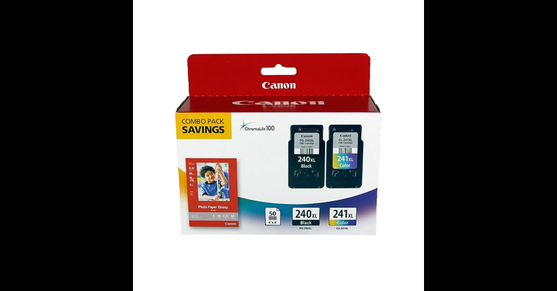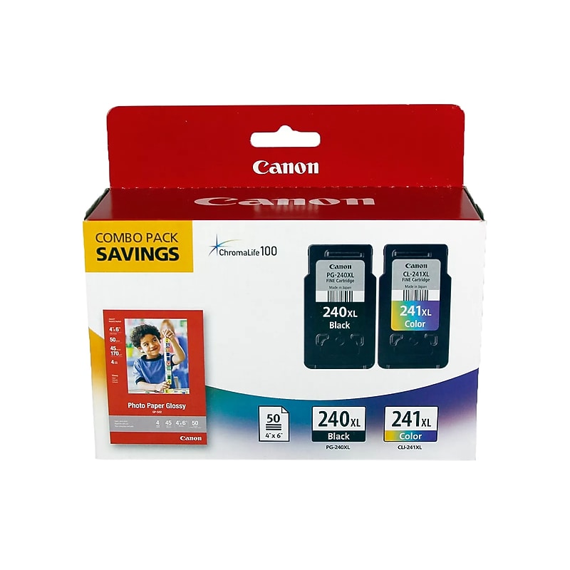 Go longer between replacements with this paper and ink cartridge combo pack. The high page yield allows for uninterrupted printing capabilities, while the included paper lets you create striking photos. These cartridges use FINE technology for rich detail and high-quality results. Compatible with select Canon PIXMA printers, the ink in this this Canon PG-240XL/CL-241XL cartridge and paper combo pack offers quick, hassle-free installation and reliable performance. Compatible with: Canon PIXMA MG2120, MG3120, MG3122, MG3520, MG3522, MG3620, MG4120, MX372, MX392, MX432, MX439, MX452, MX459, MX472, MX512, MX522, MX532, TS5120. Save time and money with this high-yield ink tanks compared to standard ones. This package includes oneink tank, one color ink tank, and a photo paper pack. Canon ink cartridge / paper kit produces superior quality for a wide array of printing needs. Multi-packs save you time and money. Print beautiful 4 x 6 photos with the included photo paper (50-sheet) and included inks. Designed with FINE (Full-Photolithography Inkjet Nozzle Engineering) technology, your prints will realize added sharpness, detail, and quality. ChromaLife100 ink technology creates long-lasting beautiful photos when used with genuine Canon photo paper. Print colorful images when you use this Canon PG-240XL/CL-241XLand tricolor high-yield ink cartridges and photo paper combo pack.