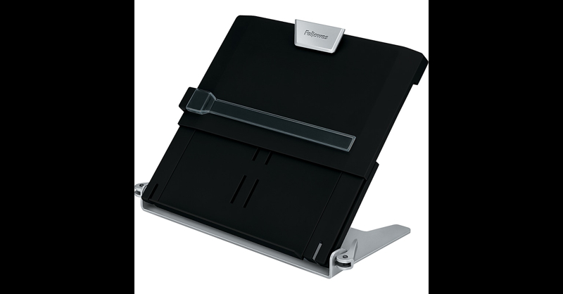 Situate forms, contracts and other documents in between your computer monitor and keyboard for easy reference with this in-line document holder. The adjustable angle makes it easy to choose the right setting for your comfort level, and a moveable magnetic line guide holds papers firmly in place. This Fellows Professional Series in-line guide folds flat for convenient storage in between uses. Promotes neutral posture and helps reduce awkward neck and eye movements. Offers six separate angle adjustments from 75 to 25 incline. Top and bottom adjust to accommodate oversized documents. Supports books, catalogs, and landscape sheets. Moveable, magnetic line guide holds documents in place. Stable weighted base; unit folds flat for easy storage. Holds up to 250 pages of letter/legal size documents. Dimensions: 7. 5"H x 12"W x 2. 5"D. 5-year manufacturer limited warranty. Keep documents visible as you type with this Fellowes Professional Series in-line document holder.