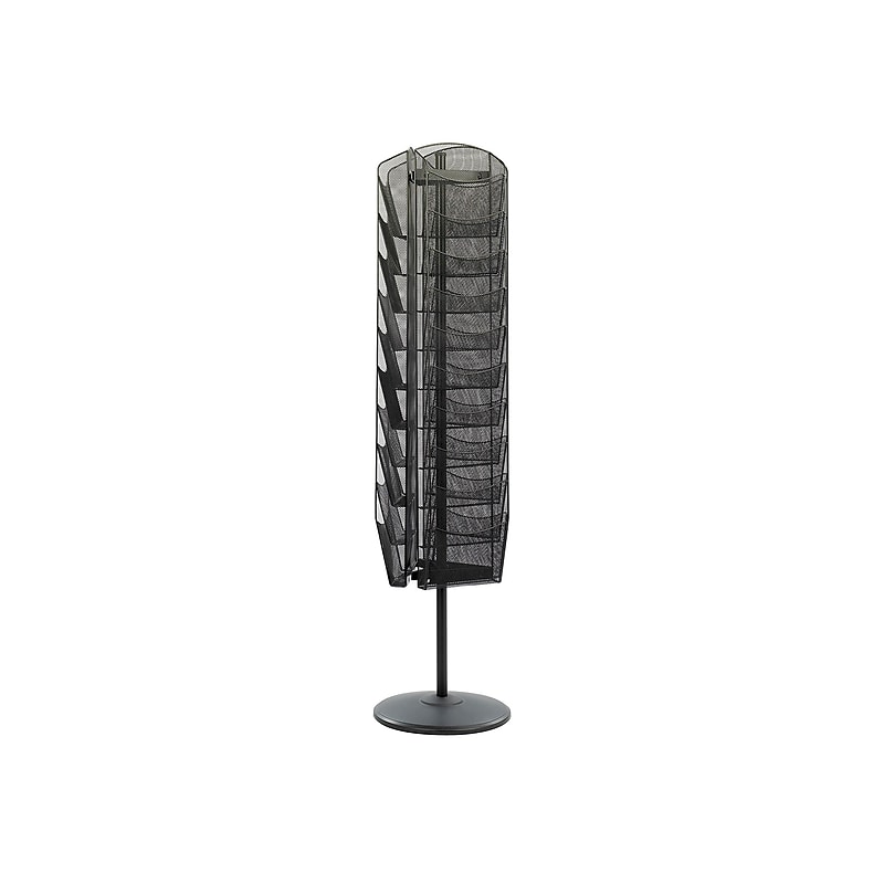 Provide easy access to pamphlets, brochures and other reading materials with this magazine display. The rotating design makes finding specific items simple, while the compact footprint takes up minimal space. This Safco Onyx magazine display features 30 pockets for flexible storage options. Three-sided rotating magazine stand with 30 pockets. steel mesh with powder-coat finish for durability. Magazine compartment size is 9. 75"W 7. 5"H, each pocket holds 0. 75" of printed material. Overall product dimensions: 66"H 16. 5"W 16. 5"D; product weight is 32. 8 lbs. Rotates 360 degrees for easy access to all materials. Pocket capacity of 5 lbs. each. One item per pack. Meets or exceeds Greenguard standards. Assembly is required. Showcase reading materials in a reception area, waiting room or retail space with this Safco Onyx mesh rotating magazine display.