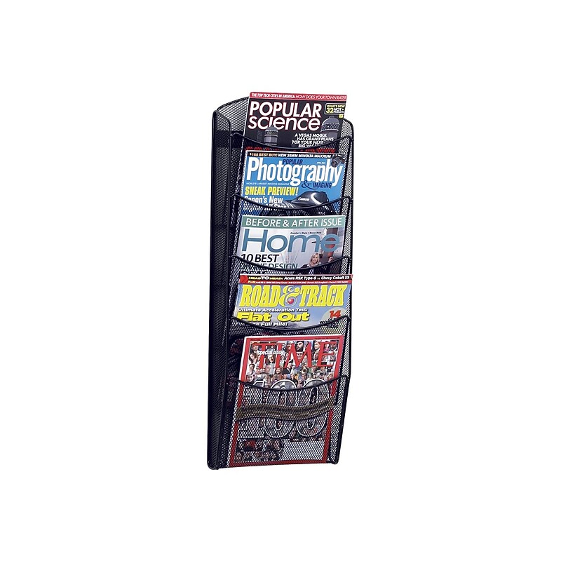 Improve organization in waiting rooms, lobbies, and other areas with this magazine rack. The five-pocket design provides plenty of storing and categorizing options, while the included mounting hardware makes it easy to secure this file to walls, doors, and other surfaces. This Safco Onyx magazine rack is made with powder-coated wire mesh for enhanced strength to withstand daily wear and tear. Hanging wall file. Holds 9. 75" x 7. 5" paper.and made of mesh steel with powder-coated finish. Five pockets provide ample space for files, folders, and documents. Dimensions: 28"H x 10. 25"W. Mounting hardware is included for easy installation. Meets or exeeds GreenGuard standard. Keep brochures, catalogs, and other reading materials on display with this Safco Onyx five-pocket magazine rack.