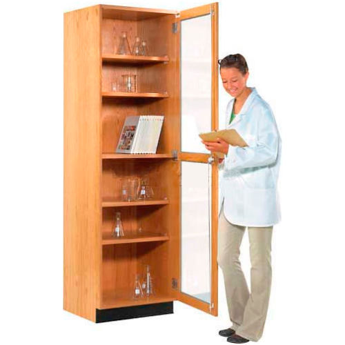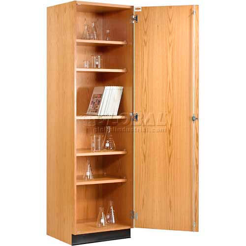 Wood Solid Door Tall Storage Cabinet 24x22x84 Tall wood storage cabinet constructed of solid oak, hardwood and oak veneers, with a clear chemical resistant UV finish. Cabinet is hinged right and has one solid locking door with a three-point locking system. Unit has two fixed shelves and four adjustable shelves. Shelves are 1"thick and the weight capacity for each shelf is 40 lbs. per sq. ft.