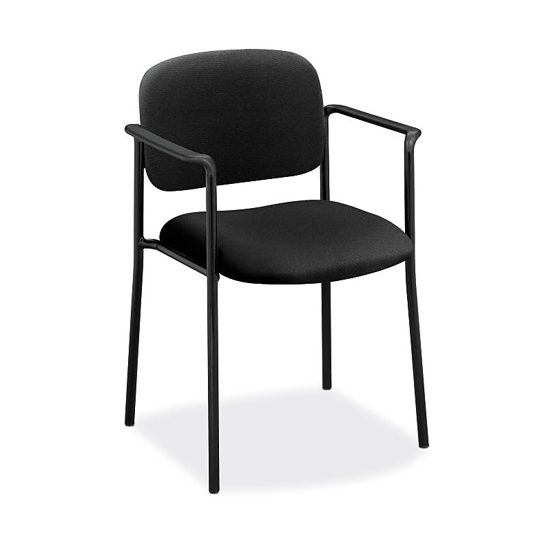 An upholstered seat and back give this chair a broad appeal at a compelling price. Seat and back upholstery color is An unbeatable combination of versatility and value for any environment. Polyester fabric is abrasion resistant; color is Tubular steel frame stands up to frequent handling. Contoured seat and back provide ergonomic support and comfort. Fixed arms provide added comfort. Frame color is Perfect for waiting, lounge or lobby areas. Padded seat and back provide a clean look that easily accommodates any existing aesthetic. Stacks up to four high for quick and easy rearrangement in multi-purpose or commons areas. Excellent for any organization seeking high performance on a limited budget. Casters and glides ship packaged together for customer's assembly choice. Backed by the HON Limited 5-Year Warranty. Model Option: HVL616. VA10. This HON Scatter guest chair with arms stacks up to four high when not in use to maximize space.