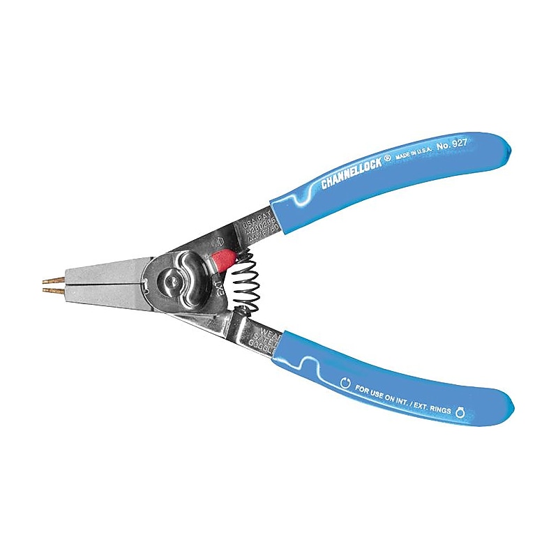 Channellock 6 1/4" Internal/external retaining ring plier features Channellock Blue grips for comfort. Plier includes 5 pairs of color coded interchangeable tips. Length: 6 1/4-inch. Size: 1. 31-inch Jaw Length. Throat depth: 3. 29-inch. Heavy duty return spring, retaining ring pliers. Includes 5 pairs of color coded interchangeable tips. Coiled spring for positive jaw opening with spring activated latch. Channellock Blue grips for comfort. 929 external: 1 1/2-4 inches, internal: 1 13/16-4 inches includes tips: 0. 090-inch, 0. 108-inch, 0. 120-inch 15 and 0. 090-inch, 0. 108-inch, 0. 120-inch 90. 927 external: 1/4-2 inches, internal: 3/8-2 inches includes tips: 0. 036-inch, 0. 047-inch, 0. 070-inch straight and 0. 036-inch, 0. 047-inch 90. 926 external: 1/8-1 inches, internal: 1/4-1 inches includes tips: 0. 023-inch, 0. 036-inch, 0. 047-inch straight and 0. 036-inch, 0. 047-inch 90. Joint: 0. 87-inch thickness x 1. 12-inch width. Heavy duty return spring. Coiled spring for positive jaw opening. Spring activated latch. Channellock Ring Plier converts internal snap ring plier into external snap ring plier by a simple finger adjustment of two sliders.
