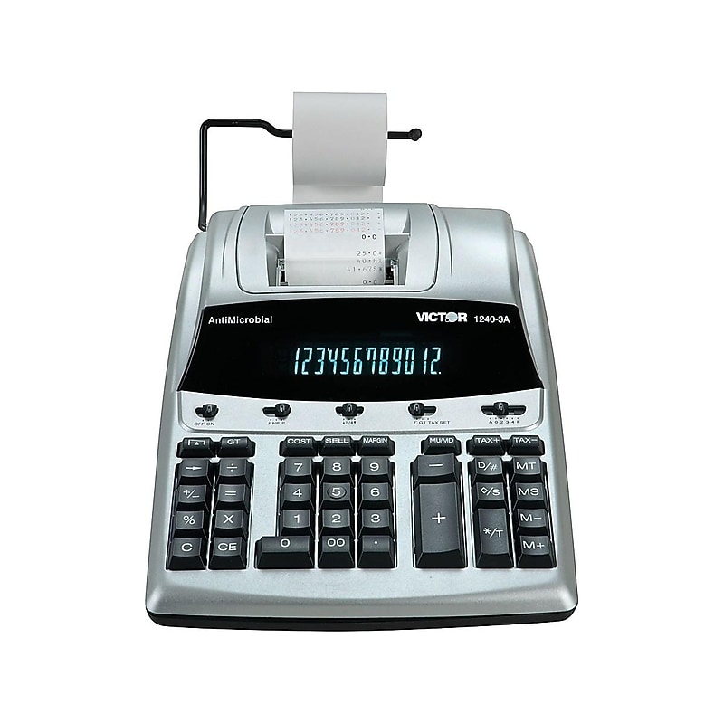 Keep track of figures around the office with this commercial printing calculator. Antimicrobial product protection makes this device ideal for use in shared workspaces, while the durable plastic construction stands up to everyday use. The large 12-digit display ensures numbers remain easy to see as you enter line items. Use the automatic tax keys to determine sales tax figures and put the cost, sell, margin, and gross profit margin functions to work when planning out future sales goals. Boasting a handy backspace key, this Victor heavy-duty calculator lets you remove mistakes without having to start each transaction over again. Printing calculator offers 12-digit VFD display for convenient viewing. Prints up to 4. 5 lines per second for quick, clear documentation. Dimensions: 3. 25"H x 9"W x 12. 75"D. Powered by any standard AC outlet, eliminating the need for expensive batteries. 4-key memory keeps often-used figures accessible for faster calculations. Streamline financial calculations with profit margin, tax calculation, cost, sell, margin, markup, item counter, discount, and non-add functions. Delta percent, decimal switch, rounding switch, sigma, percent, sign change, backspace, grand total, and time calculation functions help you solve a variety of mathematical problems. Comes Heavy-duty commercial printing calculator with built-in antimicrobial product protection. 3-year manufacturer limited warranty. Uses replaceable Victor ink ribbon 7010. Create running totals, prepare cash and checks for deposit, or handle other accounting tasks with this Victor 12-digit heavy-duty commercial printing calculator.