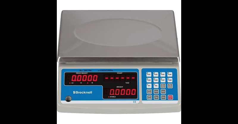 Brecknell 30-lb Digital counting scale has red LED display for easy viewing and reading. Digital counting scale has separate zero and tare keys for enhanced flexibility and accuracy. 30-lb. capacity x 0. 005-lb. accuracy. Versatile scale to weigh, count inventory or for batching parts. Bright red (adjustable) easy-to-read LED displays. Platform measures 11. 5" x 8. 75". Count Check: function allows you verify package counts when configuring upper and lower limits. Accumulation: function allows you to accumulate the piece counts for simple packing or receiving verification. Separate zero and tare keys increase flexibility and counting accuracy. Includes both AC adapter and internal rechargeable battery. Selectable auto-off timer. Maximum capacity 30lbs. 3 six digit LCD displays. Features include PLU's, Piece weight entry, upper and lower count limits, accumulation and preset tare. Dimensions: 11. 5" (L) x 13. 1" (W) x 4. 3" (H) / Platter dimensions 11. 5" (L) x 8. 75" (W). Powered by AC adapter with rechargeable battery at 20 hours battery life between charges. Functions: on/off; clear; enter; zero; tare; total, kg/lb; piece weight; PLU; print; currency; upper limit; lower limit and 0 9 for data entry. Configurable RS-232 connection. Typical applications: light industrial, part counting. Brecknell 30-lb Digital counting scale is designed to weigh, count inventory for batching parts and has selectable auto-off timer.