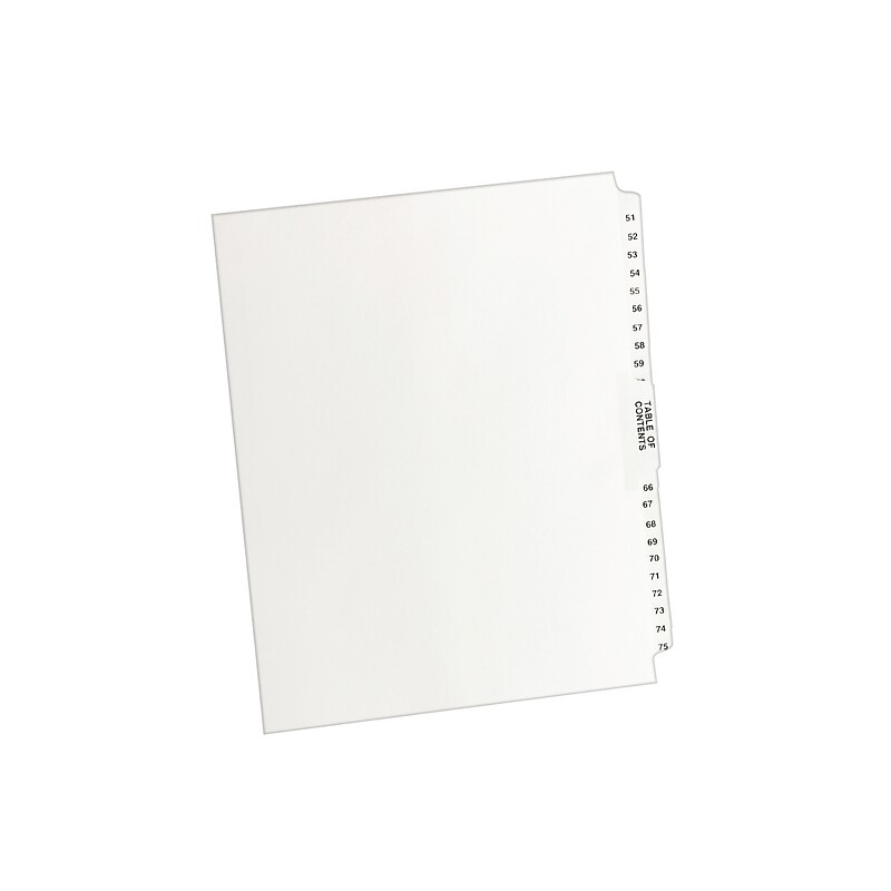 Guilty of disorderly files? It's time to crack down on chaos. This Premium Collated Legal Divider Set features side tabs 51-75 and a Table of Contents tab, so you can organize index briefs, legal exhibits, mortgage documentation files and more. The 8-1/2" x 11"paper stock features Rip Proof(TM) reinforced tabs that are preprinted on both sides using Helvetica bold type, so you can easily access the documents you need. Indexes can fit any binding system because the binding edge is unpunched. It's easy to bring order to your own files. Go ahead, throw the book at disorganization. Rip Proof reinforced, dual-sided, laminated tabs make it easy to organize your information. Unpunched binding edge fits practically any binding system. Ideal for index briefs, legal exhibits, mortgage documentation, files and more!. 1 set of letter size, side tab dividers, 51-75 and Table of Contents. Avery style is printed using Helvetica bold type. Prepare and sort documents for court with these Avery 51-75 legal exhibit dividers.