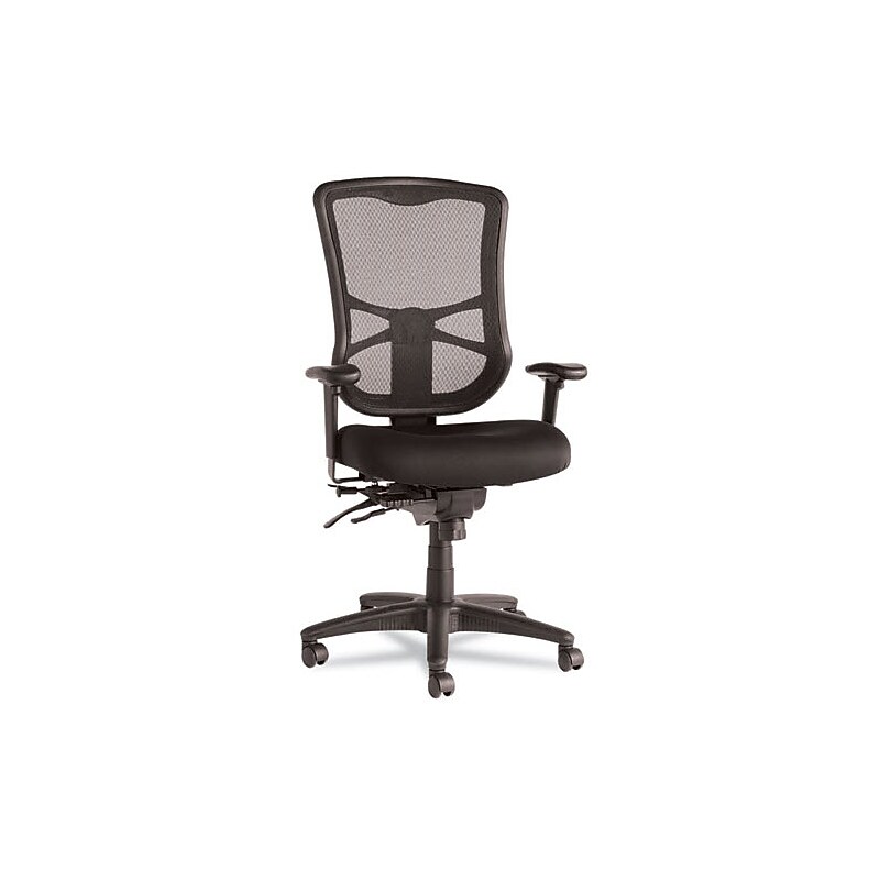 Multifunction mechanism with seat glide allows back angle adjustment relative to seat, adjustable tilt (free floating or infinite locking positions) and forward tilt. Cool, breathable mesh back. Contoured seat cushion with waterfall edge to help relieve pressure on legs. Height- and width-adjustable arms with soft polyurethane pads. Five-star base with casters for easy mobility. Computer and desk chair is a smart addition to any office space. Comes Overall dimensions: 41-46. 88"H x 25. 63"W x 27. 63"D. Seat dimensions: 20. 5"W x 21"D. Back dimensions: 20. 5"W x 23. 63"H. Width and height adjustable arms allow you to rest your forearms comfortably. High-performance asynchronous tilt lets you fine-tune your posture for any task. Weight is rated up to 250 lbs. Meets or exceeds ANSI/BIFMA standards. 5-year manufacturer limited warranty. Work comfortably by sitting in this Alera Elusion series black mesh high-back multifunction chair.