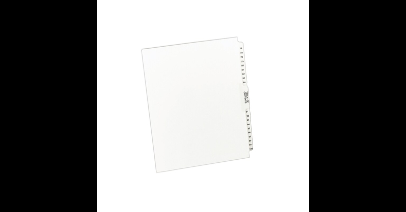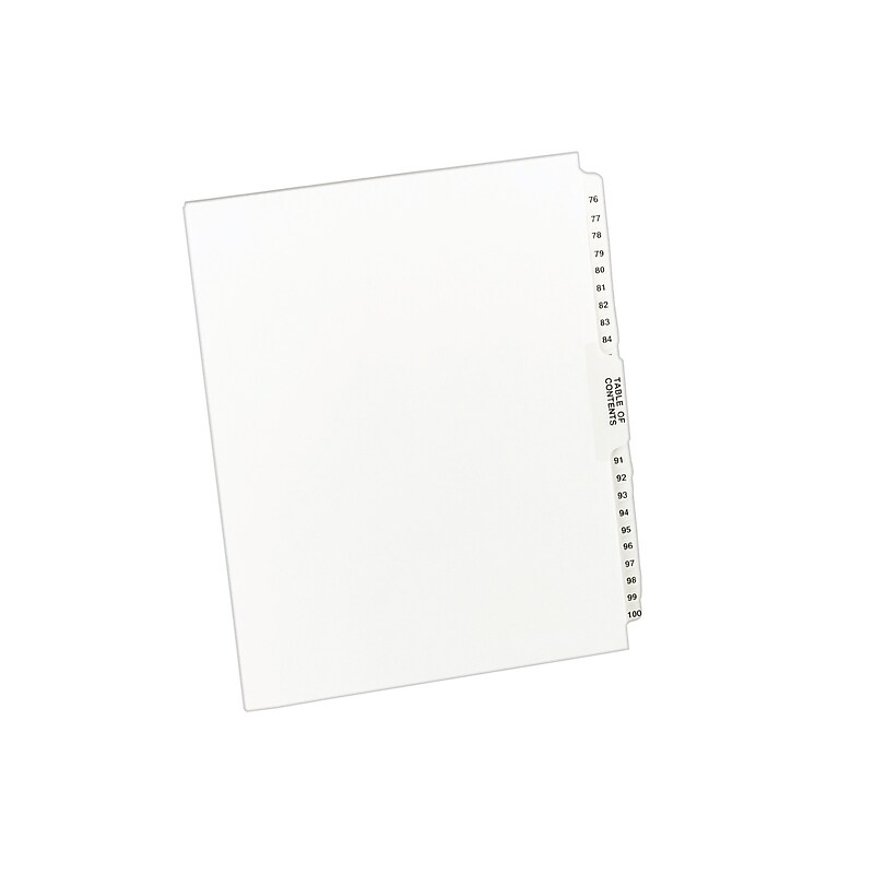 Guilty of disorderly files? It's time to crack down on chaos. This Premium Collated Legal Divider Set features side tabs 76-100 and a Table of Contents tab, so you can organize index briefs, legal exhibits, mortgage documentation files and more. The 8-1/2" x 11"paper stock features Rip Proof(TM) reinforced tabs that are preprinted on both sides using Helvetica bold type, so you can easily access the documents you need. Indexes can fit any binding system because the binding edge is unpunched. It's easy to bring order to your own files. Go ahead, throw the book at disorganization. Rip Proof reinforced, dual-sided, laminated tabs make it easy to organize your information. Unpunched binding edge fits practically any binding system. Ideal for index briefs, legal exhibits, mortgage documentation, files and more!. 1 set of letter size, side tab dividers, 76-100 and Table of Contents. Avery style is printed using Helvetica bold type. Get files in order with this set of Avery legal-size 76-100 exhibit dividers.