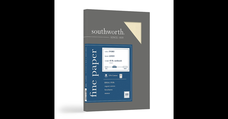 Bring a polished, professional look to your documents with this business cover stock. The 65-pound stock is ideal for printing menus, greeting cards, pamphlets, and other thick papers, while the smooth linen finish adds an upscale appearance to every printout. With a neutralcolor, this Southworth business paper helps ink and toner stand out for better visibility. Business paper ideal for proposals, presentations, reports. Ivory paper with linen finish. Paper weight: lbs. Paper size: 8. 5"W x 11"L. Each box contains 100 sheets. Printer compatibility: laser, inkjet, copier. Acid- and lignin-free. Certified by the Forest Stewardship Council (FSC). Contains 55% recycled content, 25% pre-consumer content, and 30% post-consumer fiber. Paper made with 25% cotton. Please note that packaging may vary. Create custom-printed letterheads, report covers or brochures with this Southworth 8. 5 x 11-inchlinen-finish business paper.