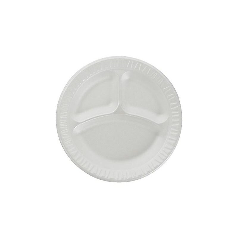 Serve up soup, ice cream, or any side dish in these durable, lightweight disposable plates. These Dart Concorde foam plates resist bending to securely contain food at cookouts, conferences, and catered events alike. Disposable plates will save you from the hassle of washing dishes. Made of polystyrene and comes This case of 500 plates provides multi-event use. 500 per carton. Plates feature three separate sections. 10. 25" plates have plenty of room for optimal serving sizes. Supply an easy, disposable option for food storage at large events with this 125-pack of Dart Concorde foam plates.