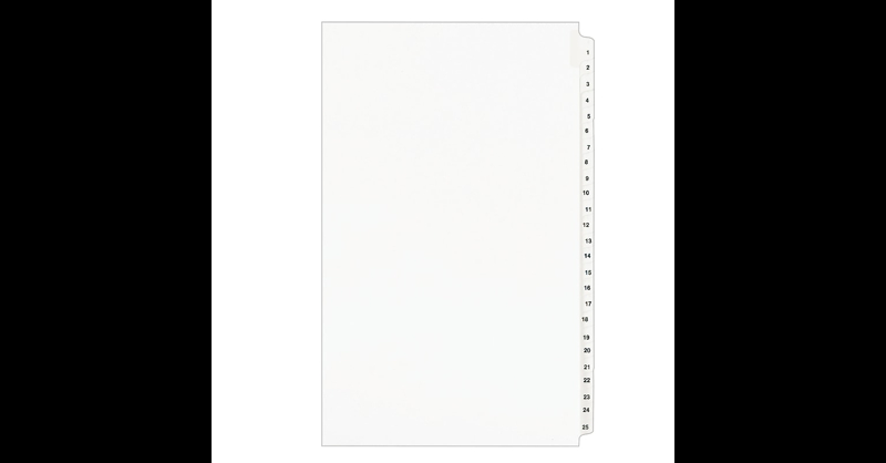 You have the right to organized and professional-looking files. This Standard Collated Legal Divider Set features Tabs 1-25 so it's perfect for index briefs, legal exhibits, mortgage documentation files and more. 8-1/2" x 14"paper stock with clear, Rip Proof(TM) reinforced tabs are preprinted on both sides using Helvetica bold type for ease of use, and the unpunched binding edge gives you the freedom to fit practically any binding system. Here's evidence these dividers will do your files justice. Perfect for Index briefs, legal exhibits, and mortgage documentation files. Unpunched binding edge so indexes can fit practically any binding system. White paper stock dividers feature clear RipProof reinforced side tabs. Side tabs are printed with Avery Style (Helvetica Bold typestyle) on both sides. Legal Size, 1-25. Number exhibits or important documents with these Avery numerical collated 1-25 legal-size tab dividers.