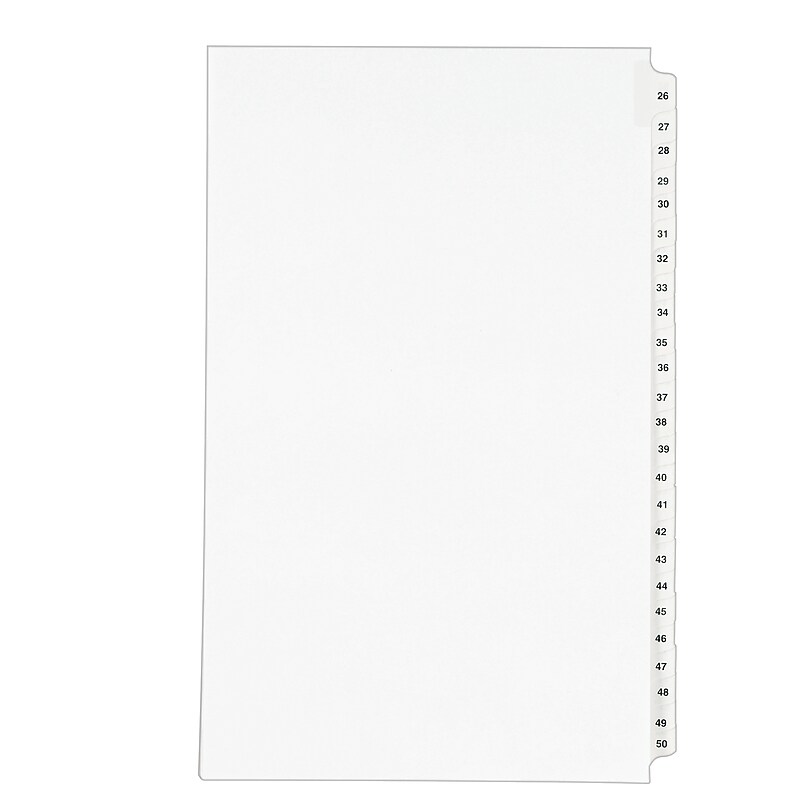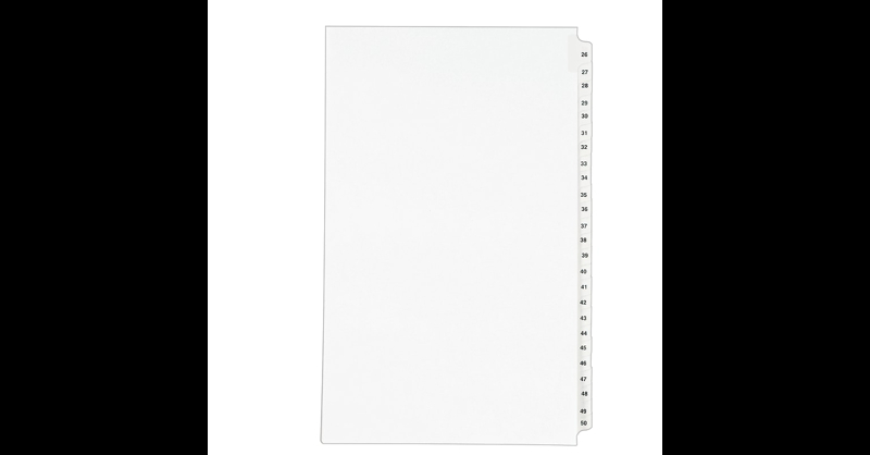 You have the right to organized and professional-looking files. This Standard Collated Legal Divider Set features Tabs 26-50 so it's perfect for index briefs, legal exhibits, mortgage documentation files and more. 8-1/2" x 14"paper stock with clear, Rip Proof(TM) reinforced tabs are preprinted on both sides using Helvetica bold type for ease of use, and the unpunched binding edge gives you the freedom to fit practically any binding system. Here's evidence these dividers will do your files justice. Perfect for Index briefs, legal exhibits, and mortgage documentation files. Unpunched binding edge so indexes can fit practically any binding system. White paper stock dividers feature clear RipProof reinforced side tabs. Side tabs are printed with Avery Style (Helvetica Bold typestyle) on both sides. Legal Size, 26-50. Avery 26 - 50 Tab numerical collated set is ideal for index briefs, legal size files, mortgage documentation files or more.