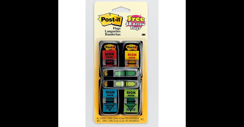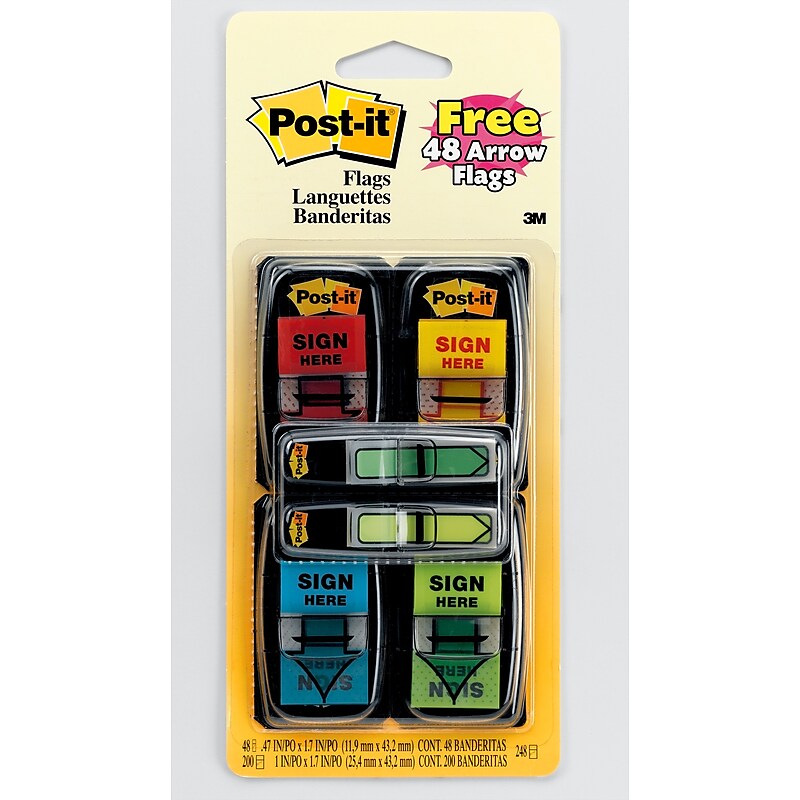 Find it fast with Post-it Flags. They make it simple to mark, flag or highlight important information. They stick securely, remove cleanly and come in a wide variety of colors. Draw attention to critical items or use them to index, file or color code your work, either at home, work or in the classroom.Colors, Sign Here Message, 1 in. Wide. Find it fast. Flags make it simple to mark and highlight important information. Ideal for marking documents without writing on them. 50/Dispenser, 4 Dispensers/Pack plus FREE Arrow Flags. Make it simple to quickly locate where each signature is needed. Allow the signature process move along at a more efficient pace. Sticks securely and removes cleanly. Dispenser keeps flags organized and easy to find.