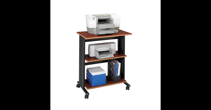 Safco Three level adjustable machine stand color measures 35" x 29 1/2" x 20" and has four casters for easy mobility. Stand features decorative PVC side panels that hide cable for a clean front office appearance. Three level adjustable machine stand. 35"H x 29 1/2"W x 20"D. Cherry, 3/4" thick melamine laminate shelves adjust in 1" increments. Perfect for desk-side use. Mobile on four casters (two locking). Some assembly required. Safco Limited Lifetime Warranty . Office accessories not included. ⚠ WARNING: This product can expose you to chemicals including Bisphenol A (BPA), which is known to the State of California to cause cancer or birth defects or other reproductive harm. For more information go to www. P65Warnings. ca. gov/furniture. Perfect for desk-side use.