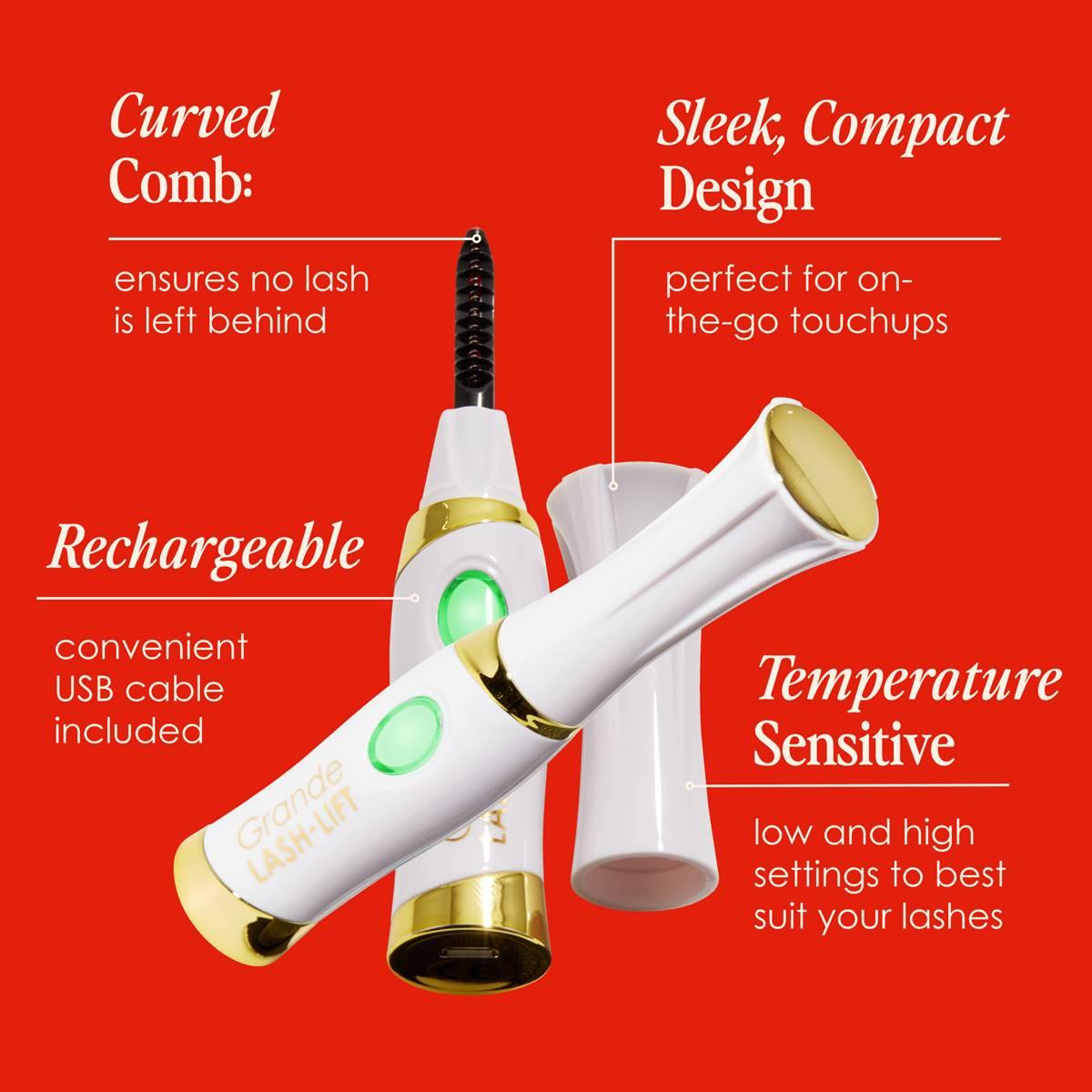 Stop the lash lull with Grande Cosmetics GrandeLASH-LIFT Heated Lash Curler. This rechargeable heated lash lift applies just the right amount of gentle heat to revitalize & lift lashes. How to use: Step 1: Press and hold the oval button on the front of the device for 2 seconds to power it on. Wait 30 seconds for the curler to heat up. The curler is ready to use when the red silicone sensor at the upper tip of the device changes from red to white. Step 2: Choose either the low or high-temperature setting. When the oval button on the front of the device is yellow, it indicates the low-temperature setting. To switch to the high-temperature setting, simply press the oval button one more time. The high-temperature setting is indicated by a green light. Step 3: Rest the curler near the lash base and pull upward, then hold for 10 seconds along the lashes for a beautiful upswept curl. Repeat as necessary. Step 4: That's it! It's that easy. To recharge, simply plug the included charging cable into the device and connect to any USB port. The device takes about 2 hours to fully charge and should last for 2 hours on a full charge. Benefits: A do-it-yourself rechargeable heated lash lift that applies just the right amount of gentle heat to revitalize and lift lashes Unlike traditional lash curlers that can lead to breakage, GrandeLASH-LIFT curls lashes without crimping or pinching Its sleek, compact design is perfect for on-the-go touchups Grooved safety slot design to protect skin and prevent heat from direct contact with the eyelid See a long-lasting curl - up to 8 hours! Curved comb design: ensures no lash is left behind Equipped with a convenient USB cable for quick recharging Temperature sensitive wire: low and high-temperature curl settings to best suit your lashes 100% saw a natural curl 100% said it gave a long-lasting curl effect 100% said GrandeLASH-LIFT lifted lashes *Based on a consumer study with 31 subjects. Results will vary.