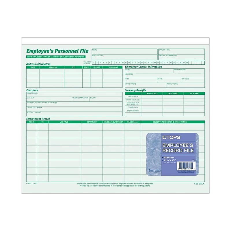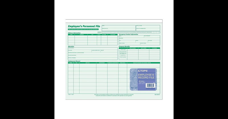 Maintain accurate records of staff payroll and performance with these employee record files. The preprinted forms provide space for personal contact information, benefits and other essential information, while the green hue makes it easy to color-code HR file cabinets. A reversible design lets you conceal sensitive information for added privacy. These TOPS employee record files feature a top-load format to keep important paperwork securely stored inside. Employee personal files include all you need to build a complete employee record. 20 personal files per pack. Comes with green ink. Dimensions: 9. 5"H x 11. 75'W. Use the front of this handy file to record employment summary. Use the back to record post-hire information. Designed to fold so confidential information is inside the folder. Compile personnel documentation in these TOPS green ruled employee record files.