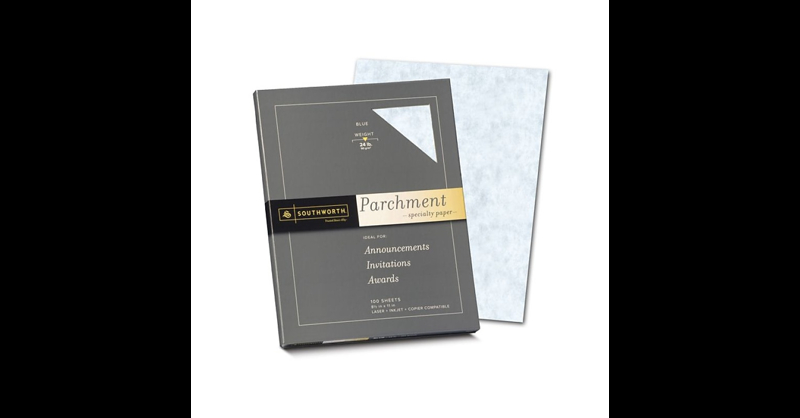 For certificates, awards, announcements, menus, invitations, presentations and more, parchment stationery, in blue, conveys distinctive old-world elegance, but are crafted to meet today's printing technology that ensure your documents have a professional look. Each sheet of paper is free of acid and lignin's, so your documents can stand the test of time and stand out with the distinguished, distinctive look of parchment.colored paper great for creating flyers, presentations, designs and more. Paper weight: 24 lbs. Sheet dimensions: 8. 5" (US letter). Brightness rating: 100. Parchment finish. 100 sheets per box. Acid Free. FSC Certified. Color: Light Blue. Manufactured in the USA. Please note that packaging may vary. Trusted Since 1839. Parchment Specialty paper is ideal for announcements, awards, invitations, menus and much more.
