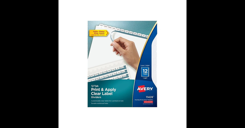 Easily create print shop quality personalized binder dividers with tabs with Avery Index Maker Clear Label Dividers. You can customize the title tabs for your dividers quickly and easily using the free templates and designs on the Avery website and print them yourself. Label sheets are optimized for inkjet and laser printers for clean, professional looking results in minutes. This pack comes with one set of 12 tab dividers, and the Easy Apply clear label strips make it simple to apply all 12 labels at once. Just print, align labels against tabs, smooth down labels and peel up strip. Each 3-hole punched durable divider also features doubled-sided, reinforced tabs and edges to help resist tearing for long-lasting, everyday use. These 3 ring binder dividers with tabs are a great addition to your medical office supplies, school binders, personal organizers, tax office supplies, presentation reports and more. Print, peel, and press your way to a perfect, precise project. Save time and money by creating your own high-quality custom tab dividers using free templates from the Avery website and printing on your laser or inkjet printer. Label all 12 tab dividers at once with the Index Maker Easy Apply Label strip that results in one perfectly aligned set of tabs. Get a professional, printed-on look with clear labels that virtually disappear on thedivider tabs. Great for organizing your medical document binder, meeting materials, proposals, tax organizer binder, financial planner and more. Long-lasting, tear-resistant tabbed dividers feature doubled-sided reinforced tabs and edges. Create custom, professional folders with this set of Avery Index Maker 8. 5 x 11-inch 12-tabclear label dividers.