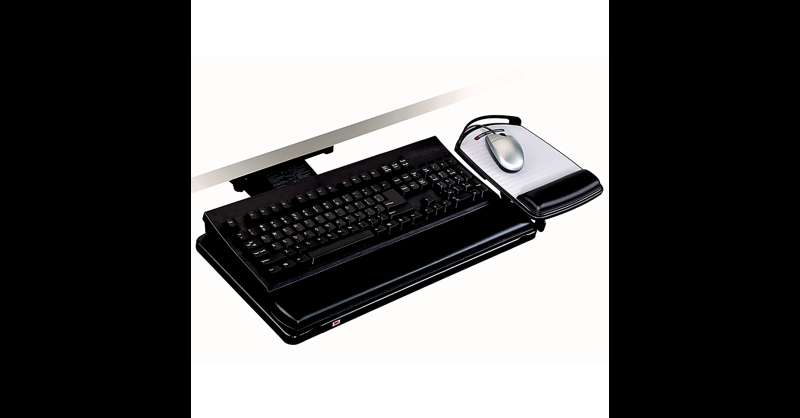 The AKT80LE gives you the ability to control height and tilt simultaneously, independent of the mouse platform. It's perfect for shallow workstations where mounting depth is at least 17. 5". Compatible with ergonomic keyboards. Lifetime warranty. Highly adjustable and sturdy keyboard and mouse platforms help get keyboard and mouse exactly where you want them for comfort. Includes easy to clean leatherette covered gel wrist rest with and Precise Mouse Pad with battery saving design that positions right or left. Required space under surface needed to mount: 24" W x 18" D. Simply turn knob to adjust height +1. 25"/-4. 5" from mounting surface and tilt +15/-15 to get to comfortable working position. Platform swivels left and right 360 and stows completely under the desk when not is use. Lifetime warranty on keyboard arm, five years on keyboard platform, and one year on gel wrist rests. 25% Preconsumer Recycled Content. Highly adjustable and sturdy keyboard and mouse platforms help get keyboard and mouse exactly where you want them for comfort.