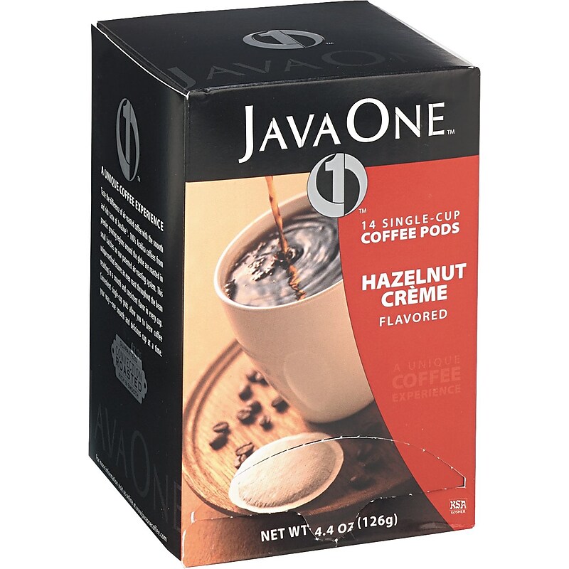 Java One 3 Single cup hazelnut creme ground coffee comes in pod each brews 8- 10 cup of coffee depending on strength preference. Coffee has unique blend of 100 percent Arabica beans with nutty hazelnut flavor and is sold as 14 pods per box. Regular caffeinated ground coffee. 3 oz. pods. Hazelnut Crme flavor. 14 pods per box. Each pod brews 8- to 10-oz. cup of coffee or tea depending on strength preference. Product is Kosher. Java One 3 Single cup hazelnut creme ground coffee is regular caffeinated and has a wonderful aroma/flavor, is sold as 14 pods per box.