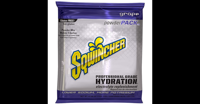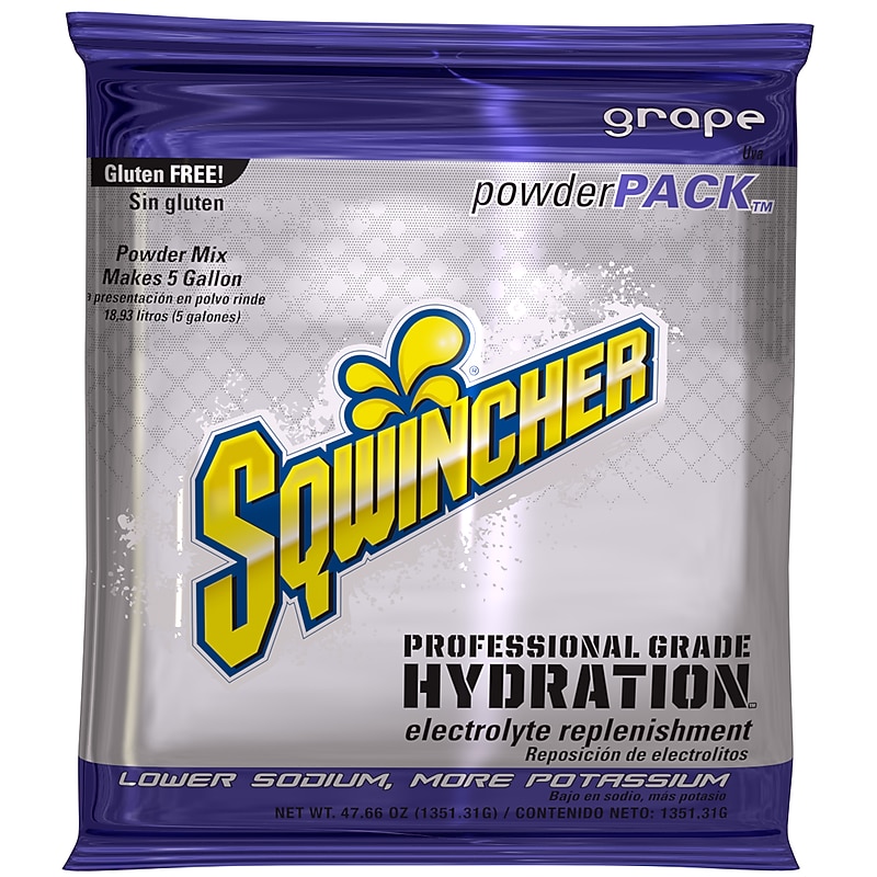 Sqwincher Grape Sports Energy Drink Powder Mix comes in 47. 66 oz. packs offering delicious taste and energy all day. Powder energy drink contains 45 mg potassium, 0. 47 mg magnesium, 55 mg sodium, 16 g carbohydrates and 60 calories. Each carton contains 16 packs. Flavor: Grape. Form: Powder. Container size: 47. 66 oz. Container type: Pack. Yield: 5 gal. Make as little or as much Sqwincher as you want. Have a glass on a hot day, or help keep the whole basketball team cool. Available in all the great tasting Sqwincher flavors. Ingredients: 45 mg Potassium, 0. 47 mg Magnesium, 55 mg Sodium, 16 g Carbohydrates and 60 Calories. Sqwincher Sports Energy Drink gives peak performance in any high-heat environment.