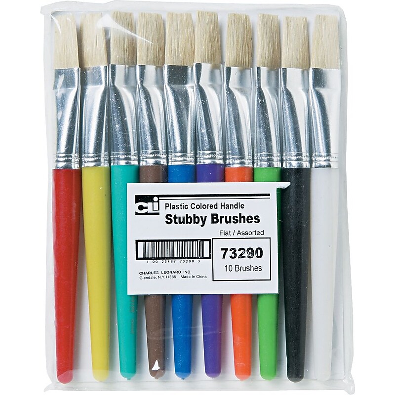 Paint Brushes, Natural Bristles, Flat, 7-1/2" Hdle, 10/ST, Asst. Includes 10 brushes per set. Helps prevent accidental color mix ups. Color coded. 10 colors include black, blue, brown, green, orange, purple, red, turquoise, white, and yellow. Paint brushes feature brightly colored 7-1/2" handles that are flat and stubby. Handles are color-coded to help teach color recognition. Includes natural hog bristles held by seamless aluminum ferrules. Ideal for small hands between the ages of 3 to 9 years old. 10 Brush(es) - 7. 50" Handle - Aluminum Ferrule - Yellow, Blue, Green, Orange, Brown, White, Turquoise, Black, Purple.