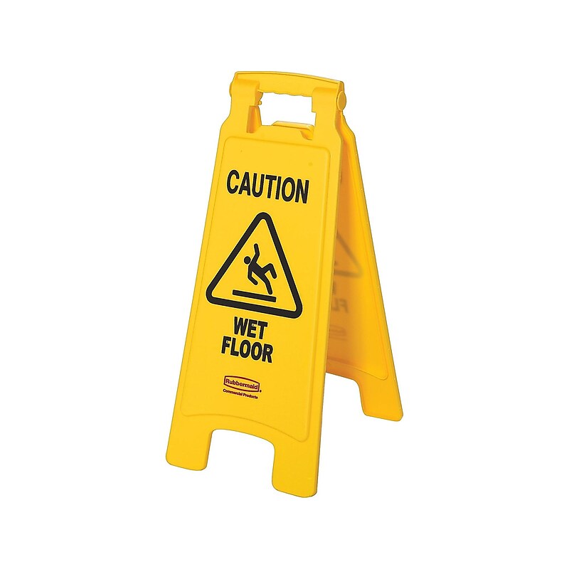 The Rubbermaid Commercial Caution Wet Floor Sign is a lightweight sign to help prevent customers, employees, and pedestrians from slips and falls. The sign folds to allow for convenient storage and transport on Janitorial Carts or Rim Caddies. The easy set up system is ideal for all floors, doorways, and narrow hallways in high traffic commercial, professional, and residential areas. PREVENT INJURIES AND ACCIDENTS: Slip and fall accidents are leading cause of injury for all age groups, which can lead to litigation towards your business. Alert customers, employees, individuals, patrons, staff, and pedestrians from potential slips and falls hazards. Reduce liability and risk of injuries using this multilingual caution sign. OPTIMAL VISIBILITY: The highly visible 2-sided sign is ideal for doorways, narrow spaces, high traffic areas, and closed spaces/zones. The bright,color and bold, black text and graphics make it easy to see and read from a distance with Caution Wet Floor warning message imprinted in English. DURABLE, STRONG, AND SMOOTH: The high quality floor sign is made of durable plastic to prevent rust and provide long-lasting durability in all types of weather, ideal for outdoor and indoor use. COLLAPSIBLE DESIGN FOR EASY STORAGE: Legs fold flat and has integrated carry handles to provide easy transport and storage on cleaning carts, rim caddies, and in closets. INCREASE PRODUCTIVITY WITH EASY-SET-UP SYSTEM: The collapsible sign making it easier for users to quickly set-up the sign in high traffic areas. COMPLIANCE: ANSI/OSHA-compliant color and graphics. Made in USA. Packaging weight: 2. 32 lbs. Alert employees and customers to potentially hazardous conditions with this Rubbermaid two-sided folding caution wet floor sign.