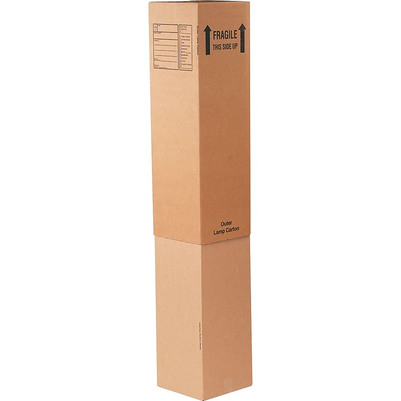 Combine with Inner Lamp Box INNERLAMP (sold separately) to make a set. Cartons are printed with fragile warning and this side up arrows and feature a convenient write on destination panel for deliver to instructions. Manufactured from 200#/ECT 32 material. Capacity: 3. 5 cubic feet. Sold as a 15/Bundle. Sold and shipped flat in bundle quantities. Holds up to 65 lbs. Shipped flat and bundled for compact storage. Inner box for the 2-piece lamp container -outer box sold separately, order both. These deluxe moving boxes are printed with a collection of special handling instructions including "Fragile," "UP" arrows and an easy-to-understand write-on destination panel. Sizes are inside dimensions (usable space) L W H(D). You must order SKU# 2729450 to complete the set.