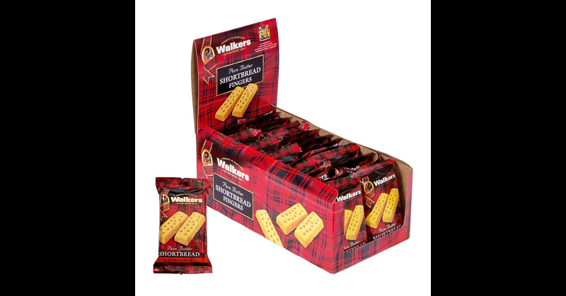 Walker's Shortbread Cookie Snack Packs are individually wrapped for convenience and freshness. Ideal for breakrooms, workplace snacks, packed lunches or afternoon tea when you need an easy, delicious snack. Walker's only uses the finest simple ingredients and contains no artificial colors, flavorings, or preservatives. Each box of Walker's Pure Butter Shortbread Fingers cookies comes with 24 snack packs, 2 fingers in each pack, total of 48 cookies making them a solid option when catering for company meetings and other events. Walker's Shortbread Fingers, Pure Butter Shortbread Cookies. Suitable for vegetarians, certified kosher with no artificial flavors, colors, or preservatives. 1. 4oz Individually-Wrapped 2-Pack. Serving Size: pack (20g), Servings per Pack: 2, 100 calories/Serving. Baked with 4 simple ingredients: butter, wheat flour, sugar, and salt. Individually Wrapped. Perhaps the best-known of all Walkers products, our traditional all-butter shortbread fingers are made using a classic family recipe which is baked to perfection in the heart of the Scotland. Enjoy individual portions for dessert or afternoon snack at your workplace. Our baked goods represent 125 years dedicated to using the same simple, all-butter, family recipe. Pairs well with coffee, tea, and milk. Perfect for the office breakroom or on-the-go snacking. This product unavailable for sale in the State of California. Supply delicious treats for meetings, trainings and other activities with this 24ct box of individually wrapped 2pks of Walker's Shortbread Fingers.