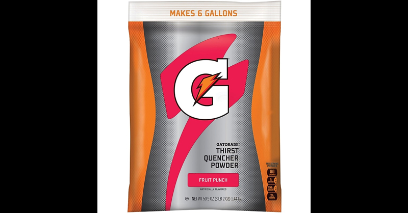 Gatorade Fruit punch dry mix energy drink in oz pack has carbohydrates and electrolytes that stimulate rapid fluid absorption. Instant powder energy drink is easy to make and offers energy to working muscles for improved performance. Flavor: Fruit punch. Form: Instant powder. Container size: oz. Container type: Pack. Yield: 6 gal. Gatorade speeds fluid absorption, and it is quick and easy to make. Carbohydrates and electrolytes stimulate rapid fluid absorption, quickly replacing the fluids and electrolytes lost in sweat. Proven energy source: Its research-proven balance of carbohydrates is unsurpassed at providing energy to working muscles for improved performance. Helps increase energy to improve performance. Ingredients: 0% Total Fat, 4% Sodium, 1% Potassium, 5% Total Carbohydrates, 13 g Sugar and 0 g Protein. Gatorade Sports Energy Drink has carbohydrates and electrolytes to stimulate rapid fluid absorption, and to quickly replace the fluids and electrolytes lost in sweat.