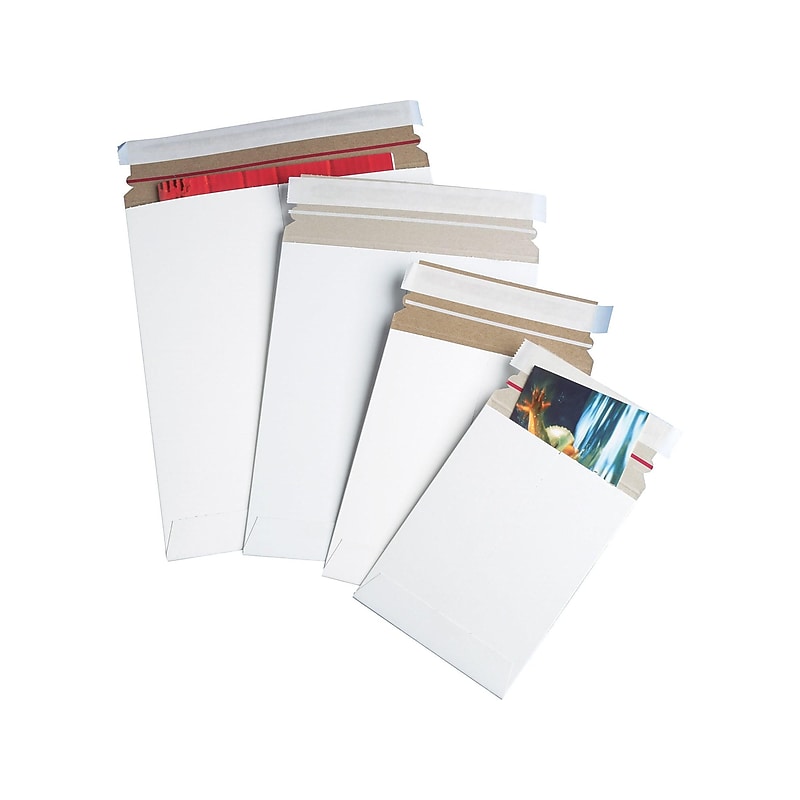 Mail magazines, brochures or photos in these Box Partners self-seal flat mailers. Theexteriors provide a perfect background for custom corporate labels and shipping tags, while the convenient peel and seal adhesive closures prevent items from slipping out of each envelope. With lightweight, durable construction, these Box Partners self-seal flat mailers protect your fragile items during the shipping process. Overall mailer dimensions: 9"W x 11. 5"L. Peel and seal closure with convenient pull tab tear strip for easy opening. Lightweight mailers manufactured fromchipboard help to reduce postal costs. Comes in a carton of 25 mailers. Protect photos and documents during shipping without the need for additional stiffeners. No additional stiffeners needed. Package reading materials and other goods in these Box Partners 9 x 11. 5-inchself-seal flat mailers.