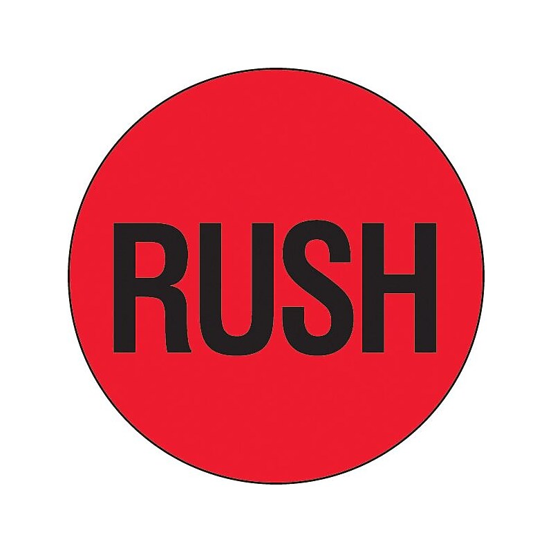 Tape Logic "Rush" Shipping label measuring x attracts attention by boldly displaying instructions as well as warnings. Label is pressure sensitive for firm adhesion, sold as 500 per roll. Label shape: Round. Machine compatibility: Label dispenser. Permanent adhesive ensures labels stay secure. Legend "Rush". Pressure-sensitive tape identifies special handling requirement. Bold labels attract attention. Instructions labels with legend. Size: 2"(W) x 2"(L). Shipping labels boldly display instructions and warnings. Self adhesive. 500 labels per roll. Get your shipment to its location faster with "rush" labels.