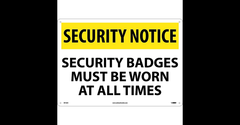 Alert visitors of important security policies. Aluminum. 14"x20". Complies With All Safety Regulations. Security Sign. National Marker "Security Notice Security Badges Must Be Worn At All Times" Safety sign measures 14" x 20" and is made 0. 040" aluminum material for added durability.