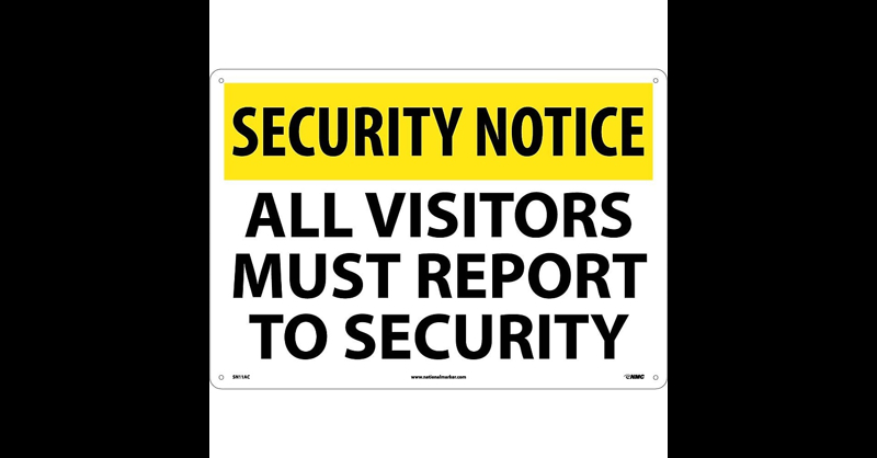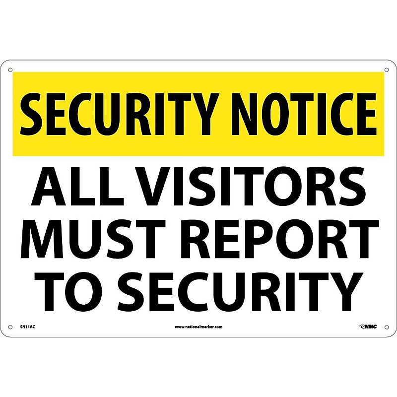 Alert visitors of important security policies. Aluminum. 14"x20". Complies With All Safety Regulations. Security Sign. National Marker "Security Notice All Visitors Must Report To Security" Safety sign measures 14" x 20" and is made 0. 040" aluminum material for added durability.