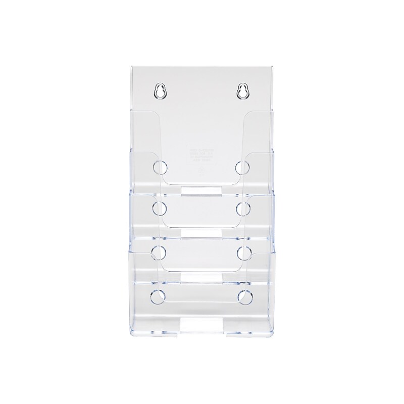 Organize brochures to be compact and visible with this Deflect-O four-tier literature holder, while saving counter space. Thispolystyrene holder has a wall mount option and can hold documents up to 5. 83 inches wide. Use this Deflect-O four-tier literature holder in your lobby or waiting room for accessible and visible leaflets. Wall literature holder lets you conveniently display signage to ensure maximum visibility. Clear polystyrene makes for easy visibility of the contents. Holds pages with portrait orientation. Dimensions: 10"H 6. 5"W 6. 25"D. Designed to hold display literature that measures 5. 83"W 8. 27"H. Four pockets for organizing and displaying your literature. Can be placed on desktops or mounted on a wall for easy viewing. Features a slanted face for easy readability. Display your leaflets clearly with this Deflect-O four-tier leaflet-sized literature holder.