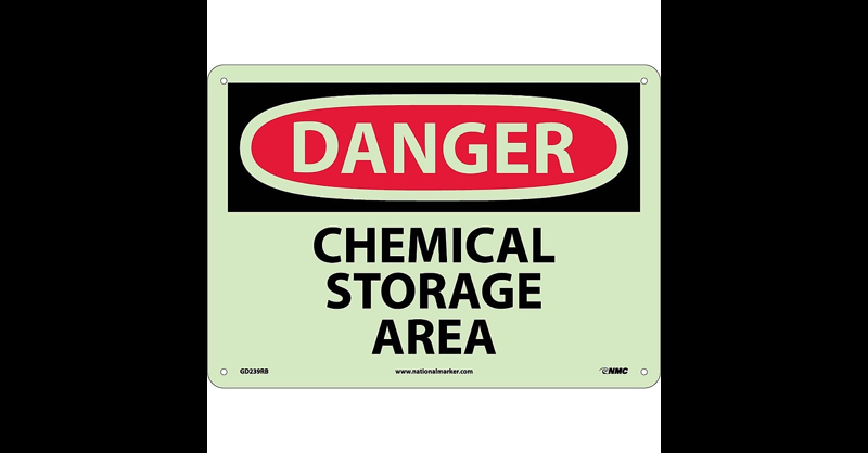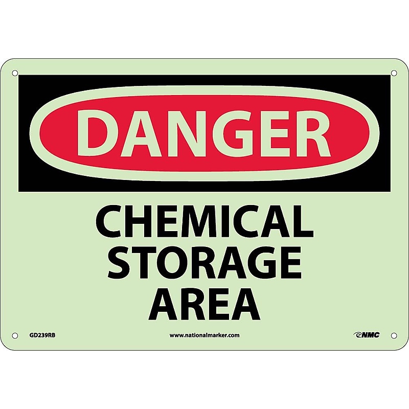 OSHA signs are the perfect way to alert your employees and guests when a hazard is present in your facility. Keep your facility safe, buy an OSHA regulated sign today and prevent an accident tomorrow. These OSHA signs comply with OSHA 29 CFR 1910. 145. 10"x14". Complies With All Safety Regulations. Glow Plastic. National Marker "Danger Chemical Storage Area" Safety sign measuring 10" x 14" is made of non-radioactive material for durability.