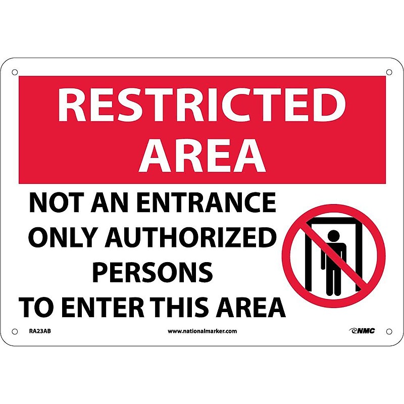 Alert visitors of important security policies. Aluminum. 10"x14". Complies With All Safety Regulations. High Visibility. National Marker "Restricted Area Not An Entrance Only Authorized Persons To Enter This Area" Safety sign with graphic measures 10" x 14" and is made aluminum material for added durability.