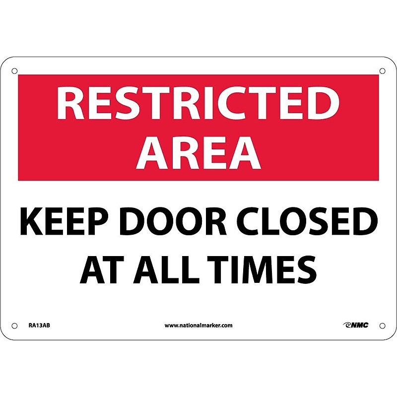 Alert visitors of important security policies. Aluminum. 10"x14". Complies With All Safety Regulations. High Visibility. National Marker "Restricted Area Keep Door Closed At All Times" Safety sign measures 10" x 14" and is made aluminum material for added durability.