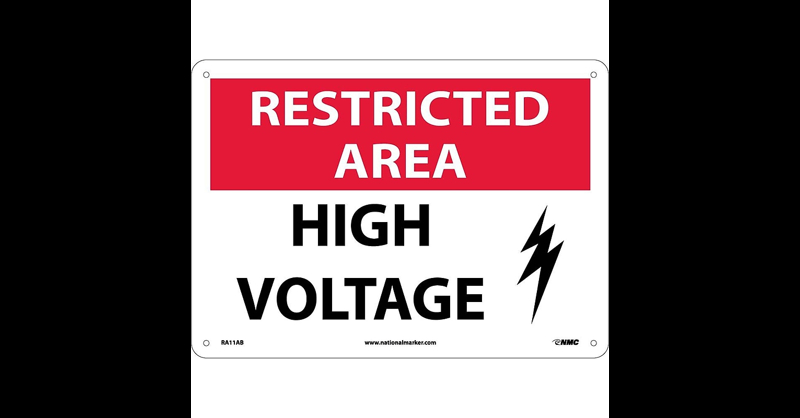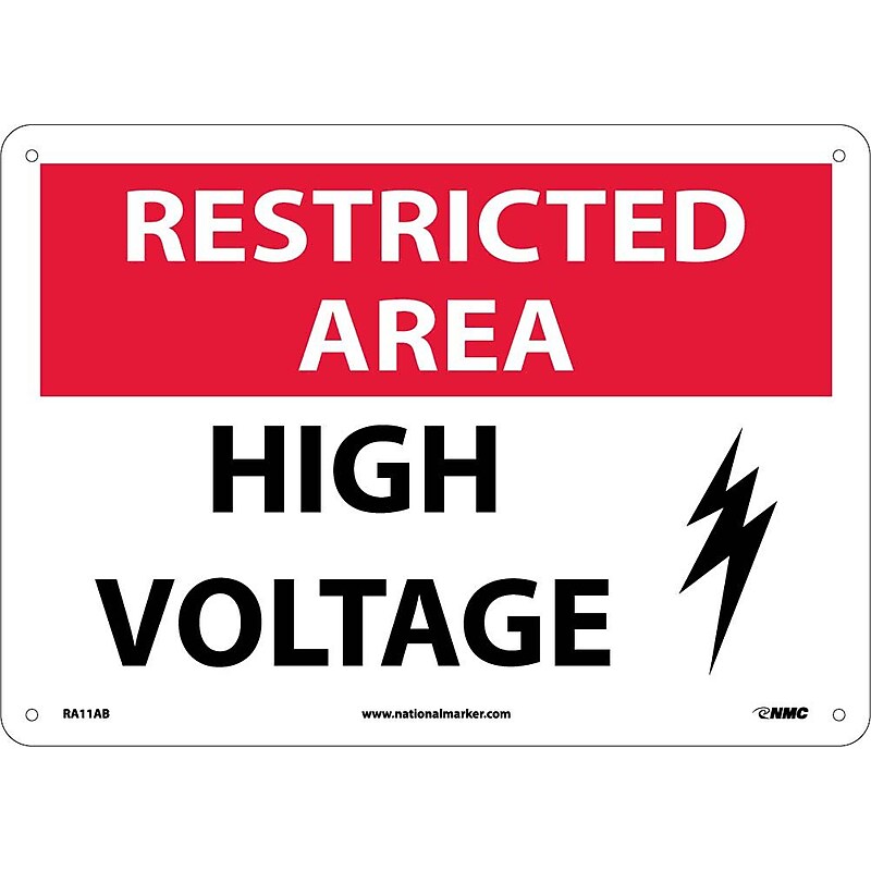 Alert visitors of important security policies. Aluminum. 10"x14". Complies With All Safety Regulations. High Visibility. National Marker "Restricted Area High Voltage" Safety sign with graphic measures 10" x 14" and is made aluminum material for added durability.