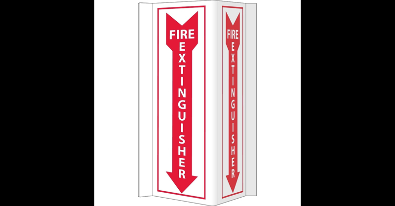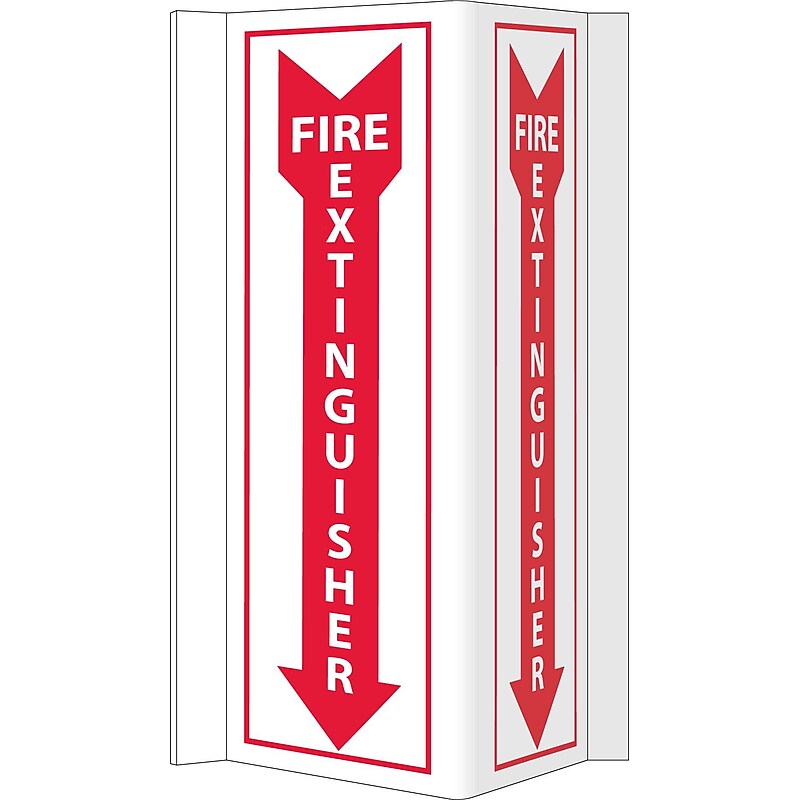 These signs provide an alternative to flat signs, they stand out from the wall allowing for viewing from multiple directions. 45 Degree Angle. 3mm PVC Plastic. Complies With All Safety Regulations. National Marker " Fire Extinguisher" Visi sign measures 16" x 8. 75" and is made 3 mm PVC plastic material for added durability.