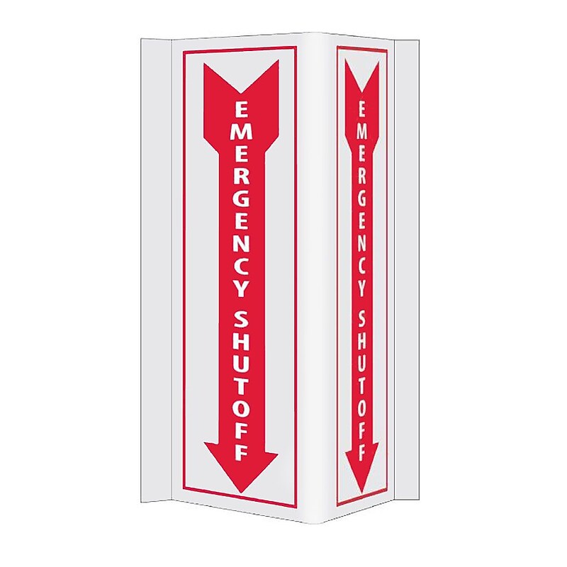 These signs provide an alternative to flat signs, they stand out from the wall allowing for viewing from multiple directions. 45 Degree Angle. 3mm PVC Plastic. Complies With All Safety Regulations. The Visi, Emergency Shut-Off, 16X8. 75, PVC Plastic by National Marker is the perfect solution for all of your Caution & Hazard Signs Needs.