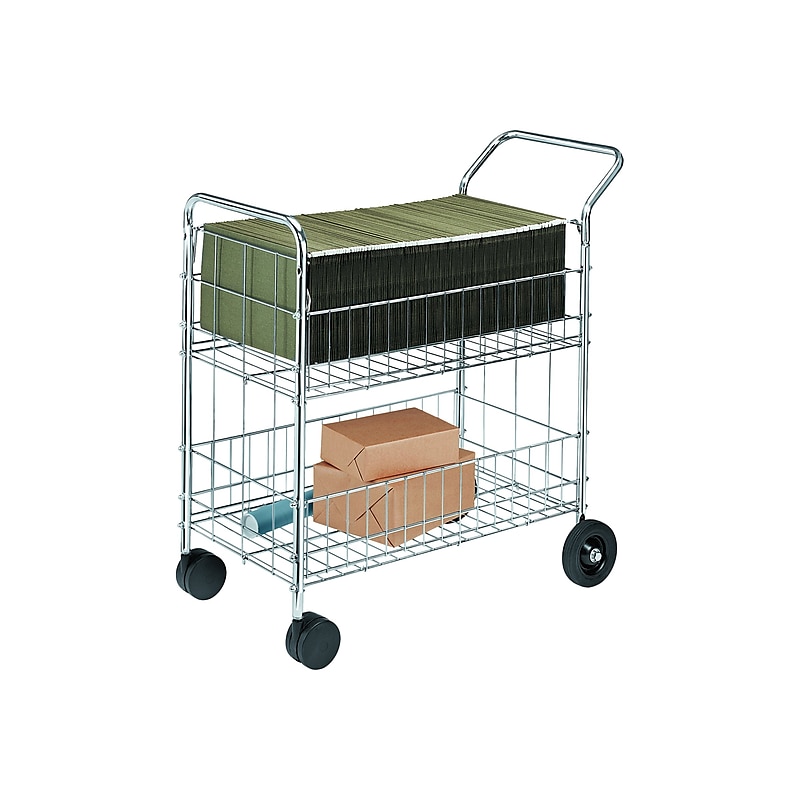 Give your mail room staff an easy way to distribute mail and interoffice mail with this Fellowes full-size mail cart. The top basket features adjustable guides for letter or legal files, and the bottom basket offers additional storage space for supplies or packages. This cart featuresplated steel wire construction and a weight capacity of 200 pounds, offering a durable and reliable way to deliver the mail each day. Chrome-plated steel wire construction. Overall Dimensions: 39. 5"H x 21. 5"W x 37. 5"D. Includes two twin wheel 4-inch diameter front casters and two rear 10-inch diameter casters. Top basket: 7"H x 17. 5"W x 30. 75"D, bottom shelf: 7"H x 17. 5"W x 30. 75"D. Assembly required. Top basket with adjustable guides holds up to 150 letter or legal files. Bottom shelf holds bulk mail or packages. 1-year manufacturer limited warranty. Assembly required. Includes twin wheel front casters and large rear wheels plusplated steel wire construction. 200 lbs. total cart weight capacity. Sort and deliver mail to office staff with this Fellowes full-size mail cart.