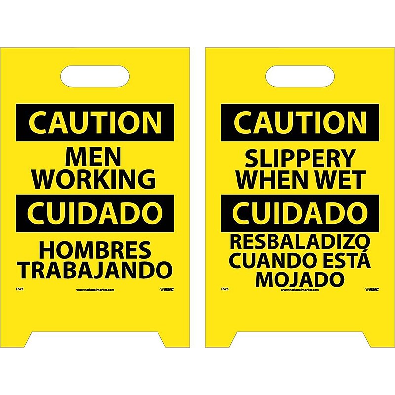 Reversible floor signs with two messages can be reversed when needed. This waterproof sign folds easily for convenient storage. 20 X 12. Corrugated Plastic. Complies With All Safety Regulations. National Marker " Caution Men Working Caution Slippery When Wet " Bilingual floor sign measures 20" x 12" and is made corrugated plastic material for added durability.