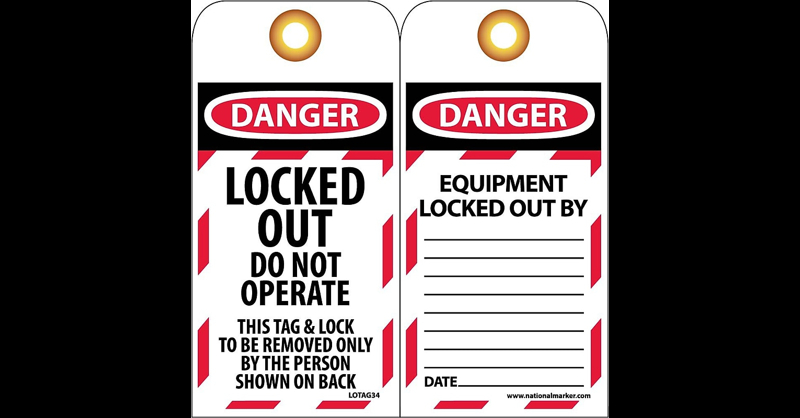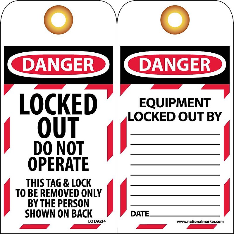 Prevent accidental or unexpected startup or release of stored energy when working on equipment and machinery. Sold 10 per pack. Unrippable Vinyl. Complies With All Safety Regulations. OSHA Compliant. National Marker " Danger Locked Out Do Not Operate" Lockout tag measures 6" x 3" and is made unrippable vinyl material for added durability.
