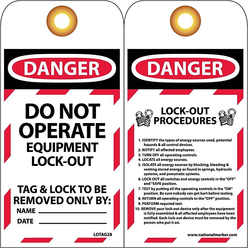 Prevent accidental or unexpected startup or release of stored energy when working on equipment and machinery. Sold 10 per pack. Unrippable Vinyl. Complies With All Safety Regulations. OSHA Compliant. National Marker " Danger Do Not Operate. . " Lockout tag measures 6" x 3" and is made unrippable vinyl material for added durability.