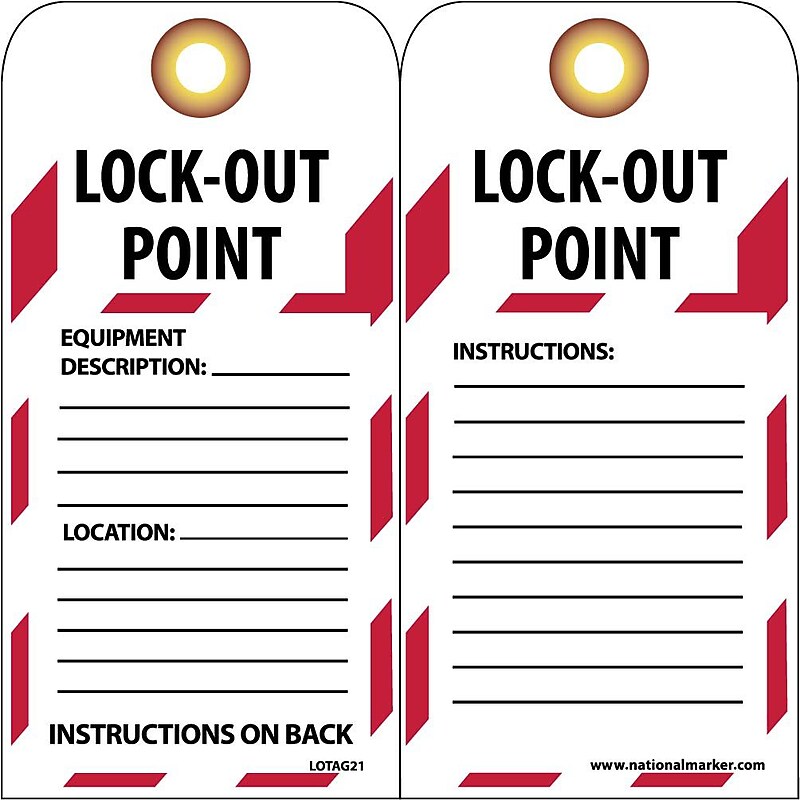 Prevent accidental or unexpected startup or release of stored energy when working on equipment and machinery. Sold 10 per pack. Unrippable Vinyl. Complies With All Safety Regulations. OSHA Compliant. National Marker " Lockout Point. . " Lockout tag measures 6" x 3" and is made unrippable vinyl material for added durability.