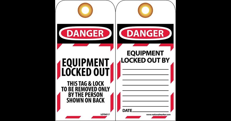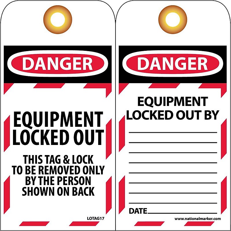 Prevent accidental or unexpected startup or release of stored energy when working on equipment and machinery. Sold 10 per pack. Unrippable Vinyl. Complies With All Safety Regulations. OSHA Compliant. National Marker " Danger Equipment Locked Out. . " Lockout tag measures 6" x 3" and is made unrippable vinyl material for added durability.