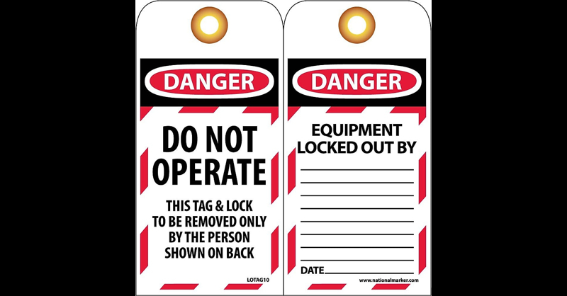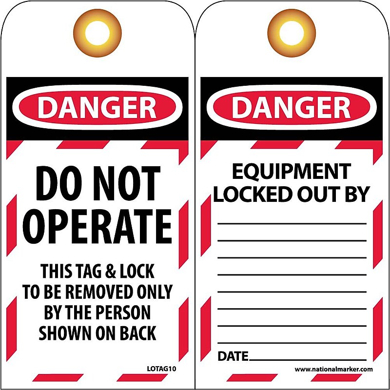Prevent accidental or unexpected startup or release of stored energy when working on equipment and machinery. Sold 10 per pack. Unrippable Vinyl. Complies With All Safety Regulations. OSHA Compliant. National Marker " Danger Do Not Operate This Tag & Lock. . " Lockout tag measures 6" x 3" and is made unrippable vinyl material for added durability.